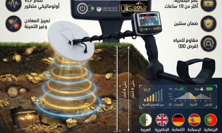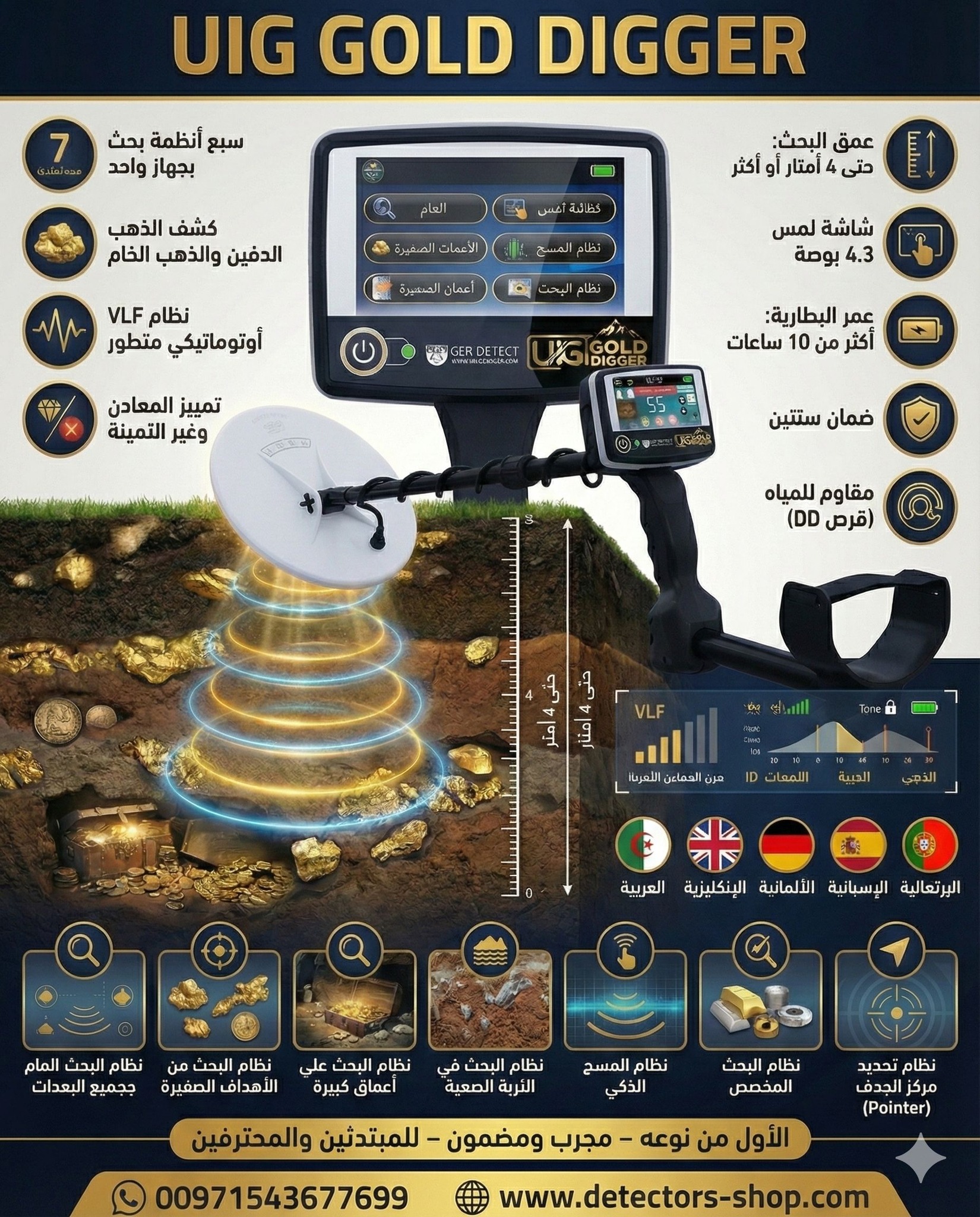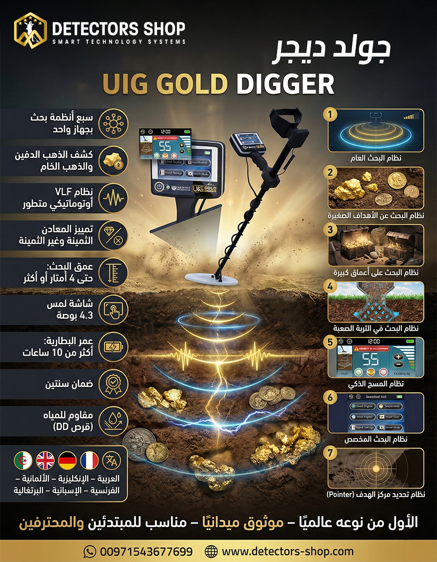 اكتشف الكنوز المدفونة مع جهاز UIG Gold Digger الألماني، أحدث أجهزة كشف المعادن والذهب، المصمم ليمنحك دقة وكفاءة عالية في مختلف البيئات. يجمع الجهاز بين الأداء العملي، تعدد أنظمة البحث، وسهولة الاستخدام، ليكون أداة مثالية لكل من الباحثين عن الثروات والمعادن الثمينة.