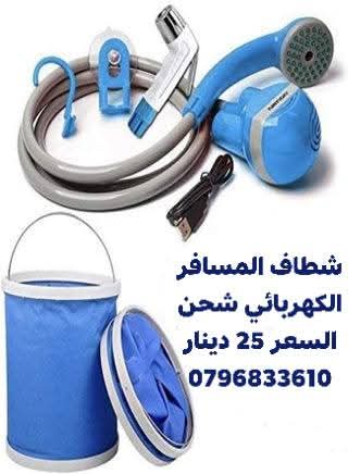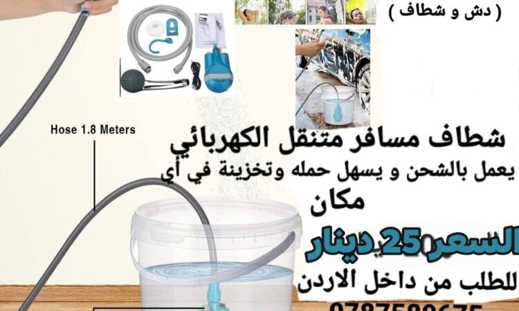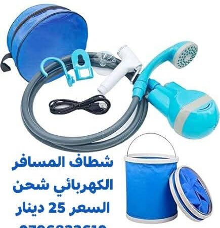 شطاف الرحلات المتنقل مع دلو مضخة صغيرة لوضعها في دلو من الماء لتوفير مياه نظيفة أثناء التنقلملحقات تأتي مع الشطاف دلو قابل للطي بسعة معينة (مثل 15 لتر).رأس دش ورأس شطاف يدوي.حامل للدش لتثبيته على الأسطح.خطاف لتعليق الشطاف أو الرأس.السعر 25 دينار