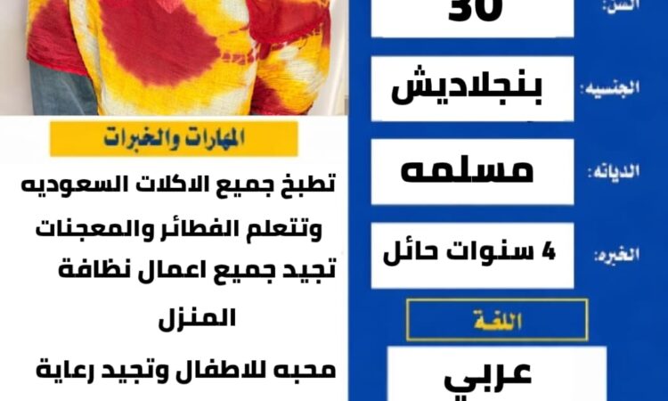 طباخه بنجاليه مسلمه للتنازل سبق لها العمل وتتكلم عربي كويس 0567237782