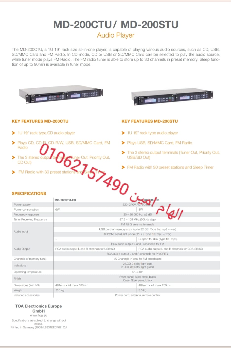 المـــــــوديل MD-200CTU-EB :البيع بضمان الشركة الدولية للتجارة والأتصالات IBC وكيل ماركة TOA اليابانى فى مصــــرللاستفسار مســـؤل المبيعـــــــات : الهــــــــا م أمـــــــين 01062157490