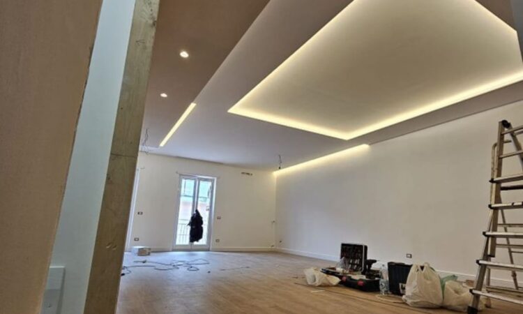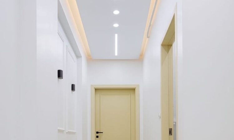 أسقف مودرن: تنفيذ أسقف مستعارة مع إضاءة مخفية وتنسيق فتحات التكييف.